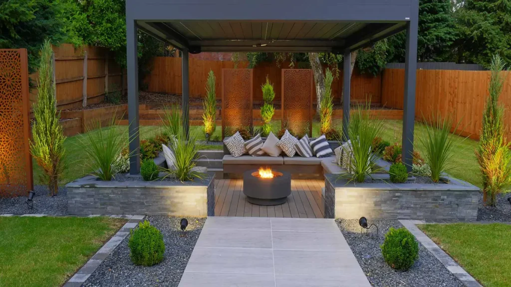 A modern garden blends clean design with natural beauty. It features minimal layouts, stylish planters, and smart lighting to create a relaxing, elegant outdoor space.